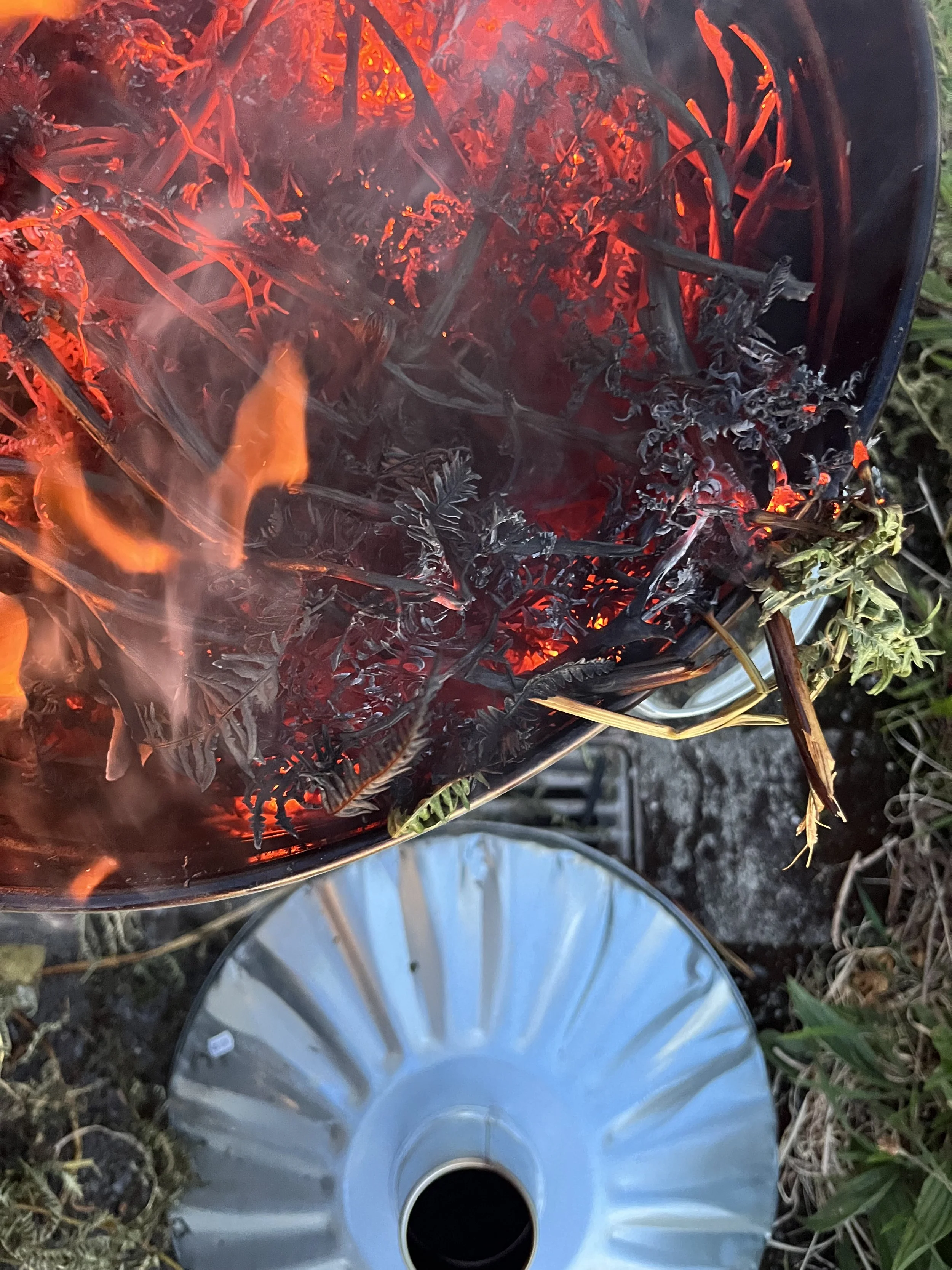 Bracken grows across the island, the fields and roadsides exploding in sea of unfurling fronds in spring. I cut and gather these fronds before leaving them to dry out. Once dry I’ll burn a batch of them in my little incinerator-bin, gathering the ash created. Bracken is known to be a strong source of potash, averaging about 25% composition (up to 55%), and so this plays a strong role in the final glaze the ash creates.